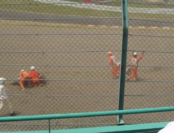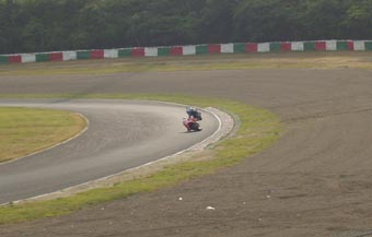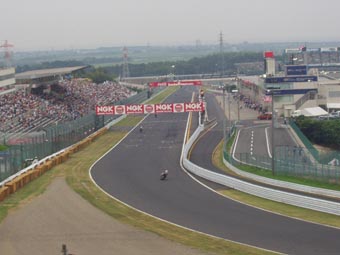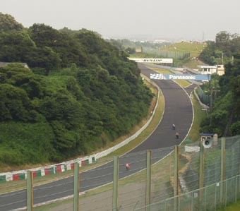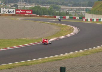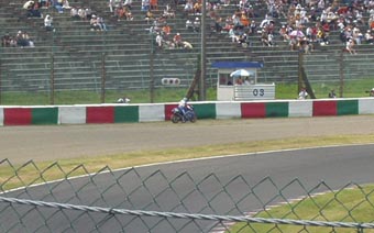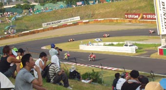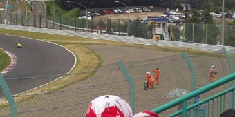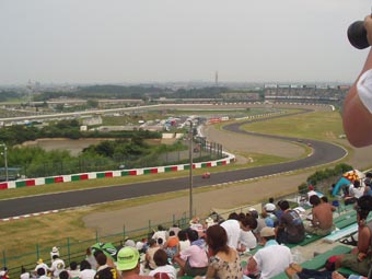 さて、お仲間とのまったりランチを堪能した後は再び戦場へと繰り出すことにしませう。ここで私は「旅」に出ることにしました。グラスタ裏から1コーナー方面より延々とサーキットの隅々に至るまでの1周ツアーです。 それでは行ってまいります―っ 〜S字コーナー席から1〜2コーナー方面を望む。 |