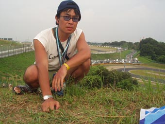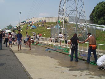 1コーナー脇には散水栓のようなものがあり、アチチの身体に振り掛ければこれまたいと涼し・・・。お子ちゃまが、スッポンポンで水遊びをしてました。コース上で熱い闘いが繰り広げられている傍らで、なんだかほのぼの〜 |