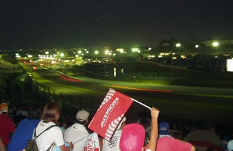 すっかり夜の帳が下りて、ナイトランでの攻防です。 どうやら心配していた雨脚も収束し、残念ながら?このままの結末となりそうです。 傍らに望む観覧車もライトアップされ、コース上での熱い闘いとは裏腹に、綺麗で幻想的な雰囲気を醸し出していました。 |