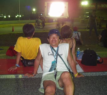 ってなところで、ハイチーズ♪ これが本日私のフル装備でございます。 右肩からはブロックアイスと缶ビール数本。そして前夜テイクアウトの”手羽先”2箱で満載のクーラーバッグが下がっています。その他左側にはデジカメやら財布やらでパンパンのポーチと、小脇にレインボーカラーのクッション、あと前夜のグラスタ・オフの時にmayumieさんちのお嬢様方にいただいたSUZUKIの応援旗を抱えたその様は・・・はい、何とも言い様のない異様なオッサンのできあがりでございますです。 |