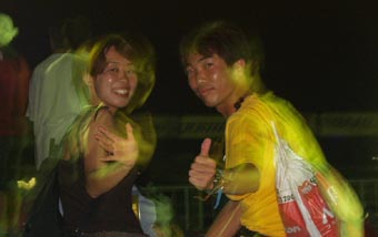 遠く、暑く、そして熱く・・・スケジュール的にもかなりの強行軍で臨んだこともあり疲労困ぱいピークに差し掛かっているにも関わらず、見よ!この2人の魂の抜けきった...もとい、天真爛漫な笑顔を!...ってな感じですね(笑) 私は思います。初めて8耐を鈴鹿まで観に行った人の結末は2通りあると思います。「あんな思いはもう二度とごめんだぁ―っ!もう絶対に行くもんかぁ―っ!」というのと「・・・ハマった!ずっぽりと。」というものとに。果たしてこの2人は前者でしょうか?後者でしょうか?.....はいはい、2人とも「後者」と申しておりますです。んだば、是非来年も!ですね。 |