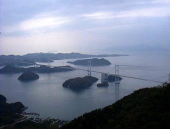 幸運にも霧は全く出ておらず、佐田岬メロディーラインを快調に走る。わぉ!ほんの一瞬だけ左右に海が見えた。空はだんだん明るくなってくる。気持ちいいっ。佐田岬に到着。灯台まで歩くと20分かかるとツーリングマップルに書いてあったので駐車場から景色を眺める。あれが九州なのね〜。昨日寄った道の駅で揚げたてのじゃこ天を食べてから、海沿いのR378(夕やけ小やけライン)を走る。道はいい感じだし初日以来の快晴で気分は最高。道の駅ふたみ(P.80 C-4)で海を眺めながらいか焼きをぱくぱく。かなり大きくてすっかり満腹。地元のライダーさんお墨付きのおいしさだ。松山市の民芸伊予かすり会館(P.73 F-5)で伊予絣(日本三大絣のひとつ)を見学した後、向かいのジェラードやさんで伯方の塩とぼんたんのダブルをゲット。四国側の来島海峡展望館(P.64 C-3)に行く予定だったけど、ジェラードやさんに大島の亀老山(きろうさん)展望台(P.64 D-3)を勧められ予定変更。海沿いのR196を走り来島海峡大橋を渡って亀老山展望台へ。すっご〜いっ!来島海峡大橋と来島海峡を一望出来る。晴れてて良かったぁ。来て良かったぁ。(^^)